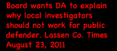 Lassen County's Board of Supervisors unanimously approved on Tuesday, Aug. 16, a short-term contract with a Reno, Nev. private investigation firm that provides services to the Lassen County public defenders office. But as soon as possible within the next 30 days the board wants to review the standing of' all private investigators within the county in an attempt to discover why Bob Burns, the Lassen County District Attorney, reportedly has issues with the credibility of the local private investigators.